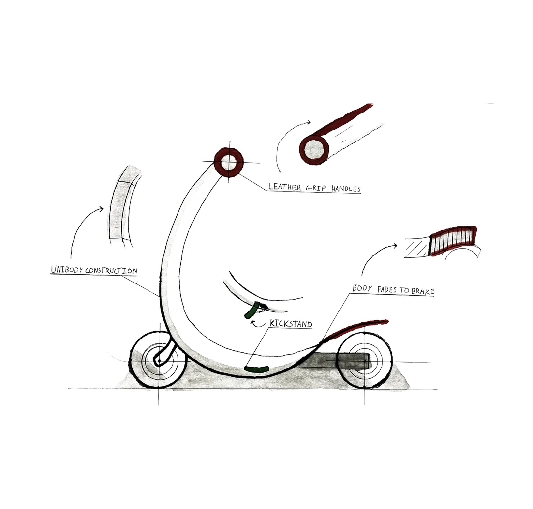 Rental scooters often feel overdesigned, with cluttered branding and heavy forms. My goal was to create a version that instead aligns with MUJI through intuitive use, natural materials, and a restrained color palette.