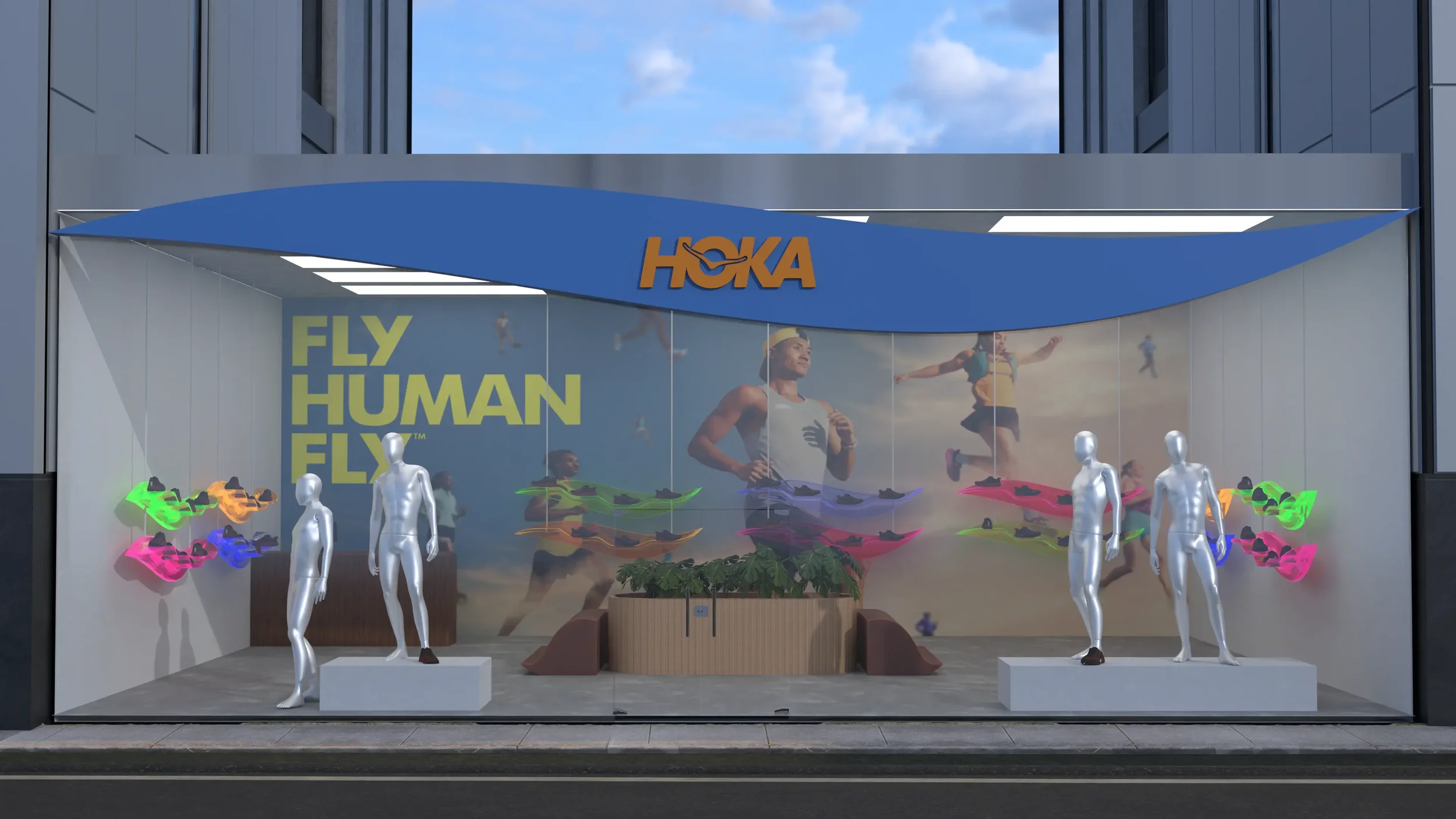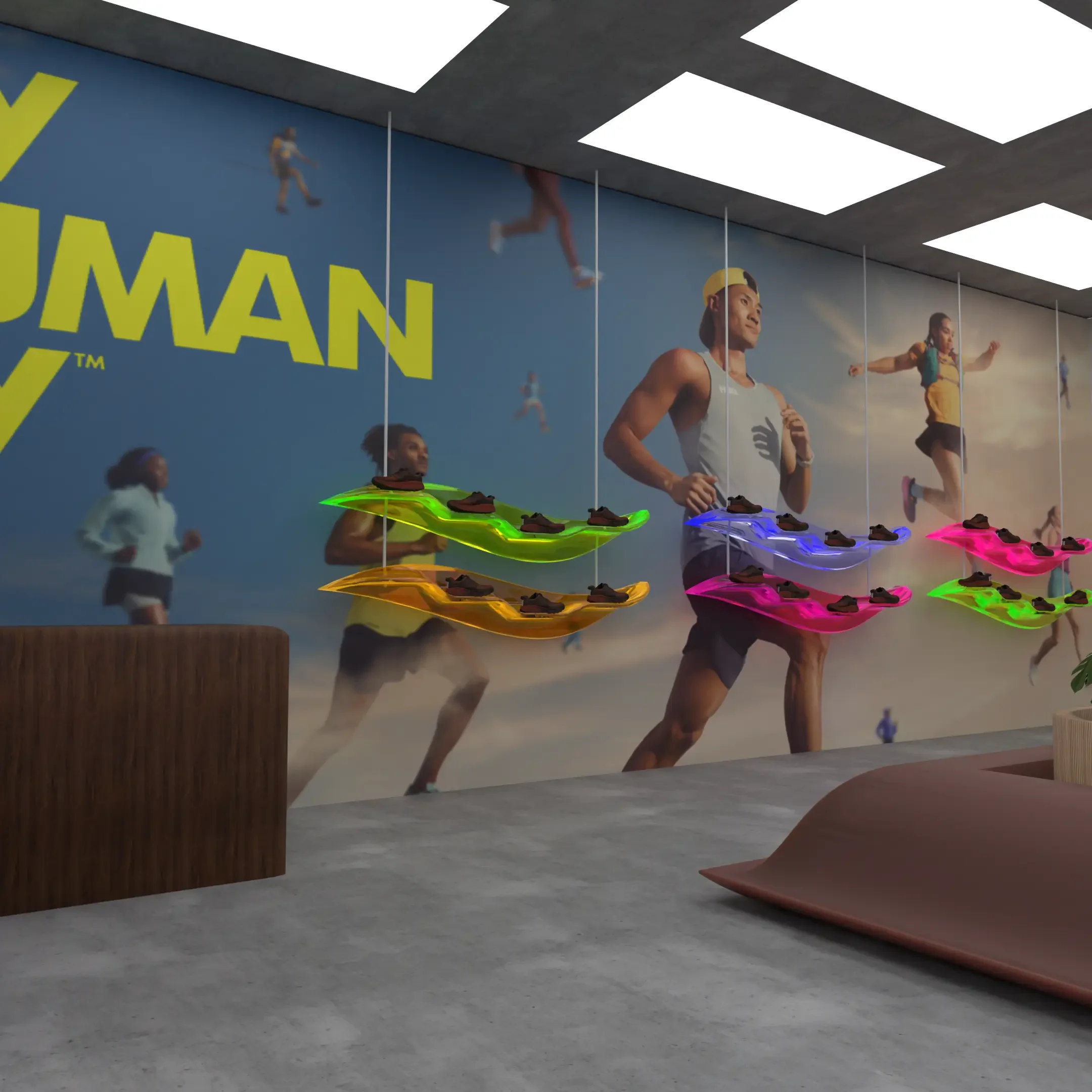 While applying for a brand manager role, I explored how HOKA’s signature swoosh could move beyond footwear and shape the store environment itself.